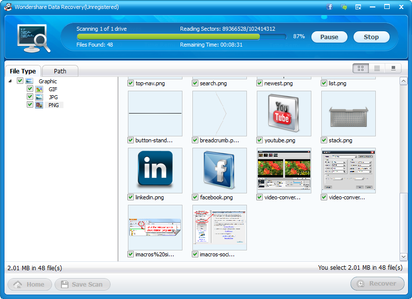 This file recovery tool allows you to retrieve deleted files of up to 550 unique file formats, including images files (JPG, TIFF, PNG, BMP, GIF, PSD from Adobe Photoshop, RAW, etc.), documents (such as DOC & DOCX from Microsoft Word; XLS & XLSX from Excel; PPT, PPX, PPS, PPSX from PowerPoint; PDF files; HTML Web pages; EPS from Adobe Illustrator or CorelDRAW; INDD from Adobe InDesign, etc.), emails (PST, DBX, EMLX, etc.), videos (MP4, AVI, FLV, MKV, WMV, MOV, MPG, SWF, etc.), audios (MP3, AAC, AIFF, WAV, OGG, etc.) and archives ( RAR, ZIP, SIT, etc.)